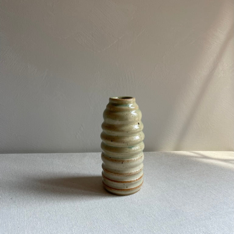 Wheel thrown petal vase with wavy design to sides. Glazed in a light green finish...