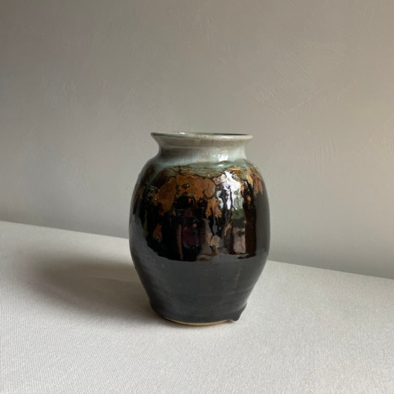 Wheel thrown pottery vase with blue, dark brown and gold glaze. Fully glazed on the...