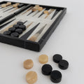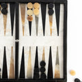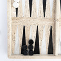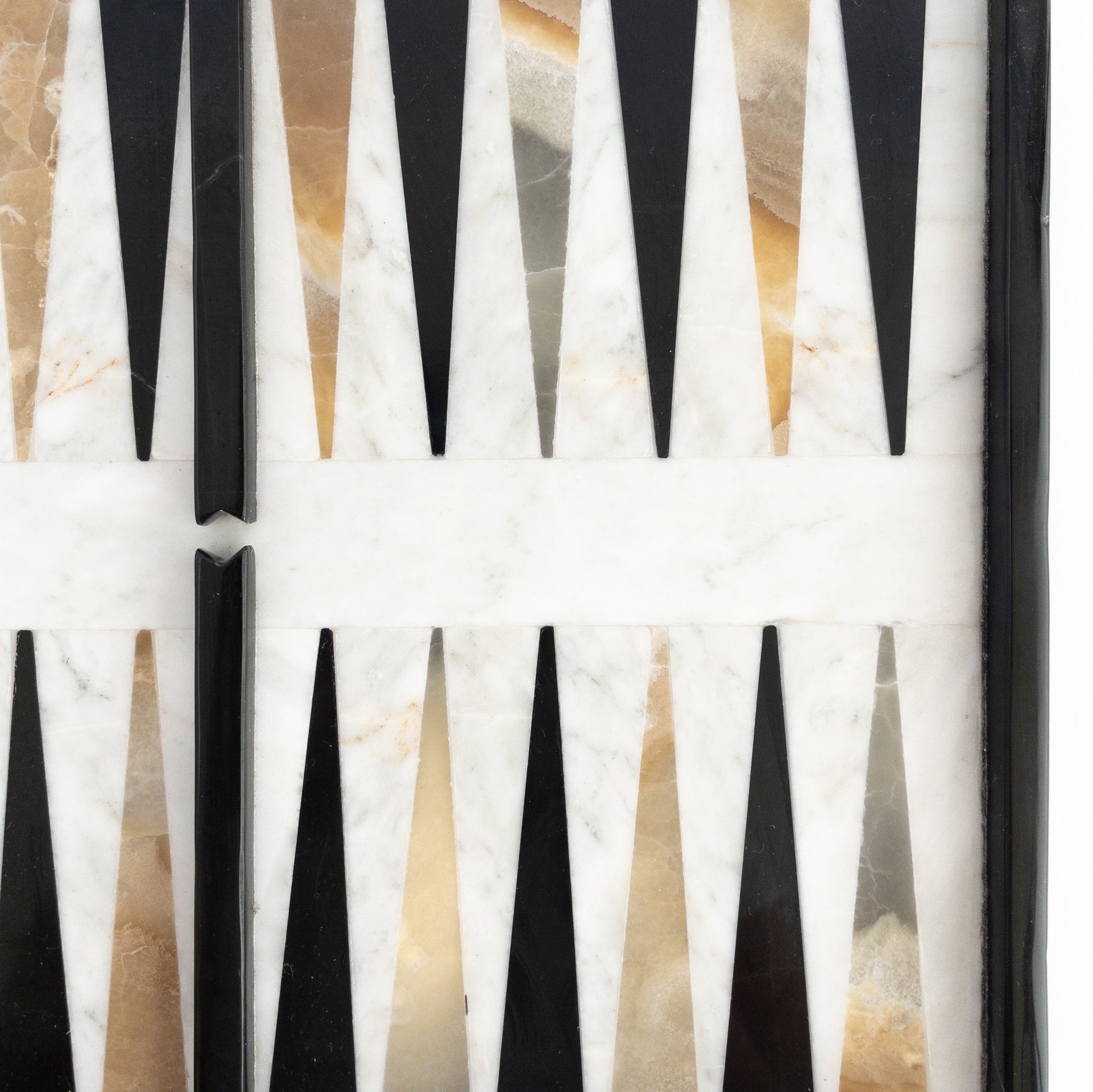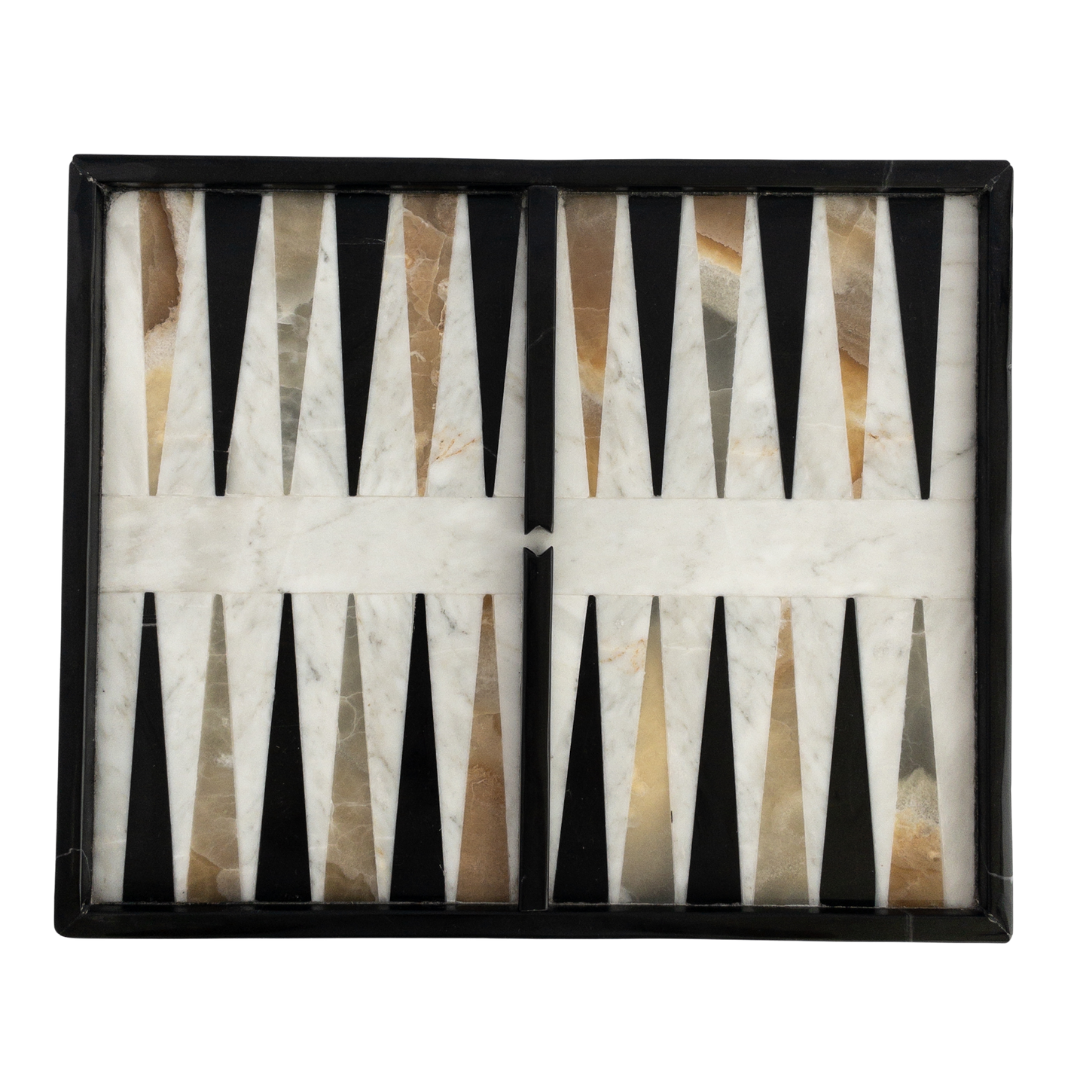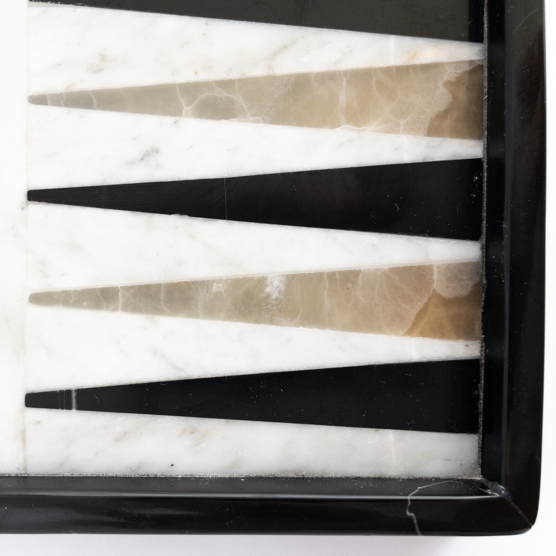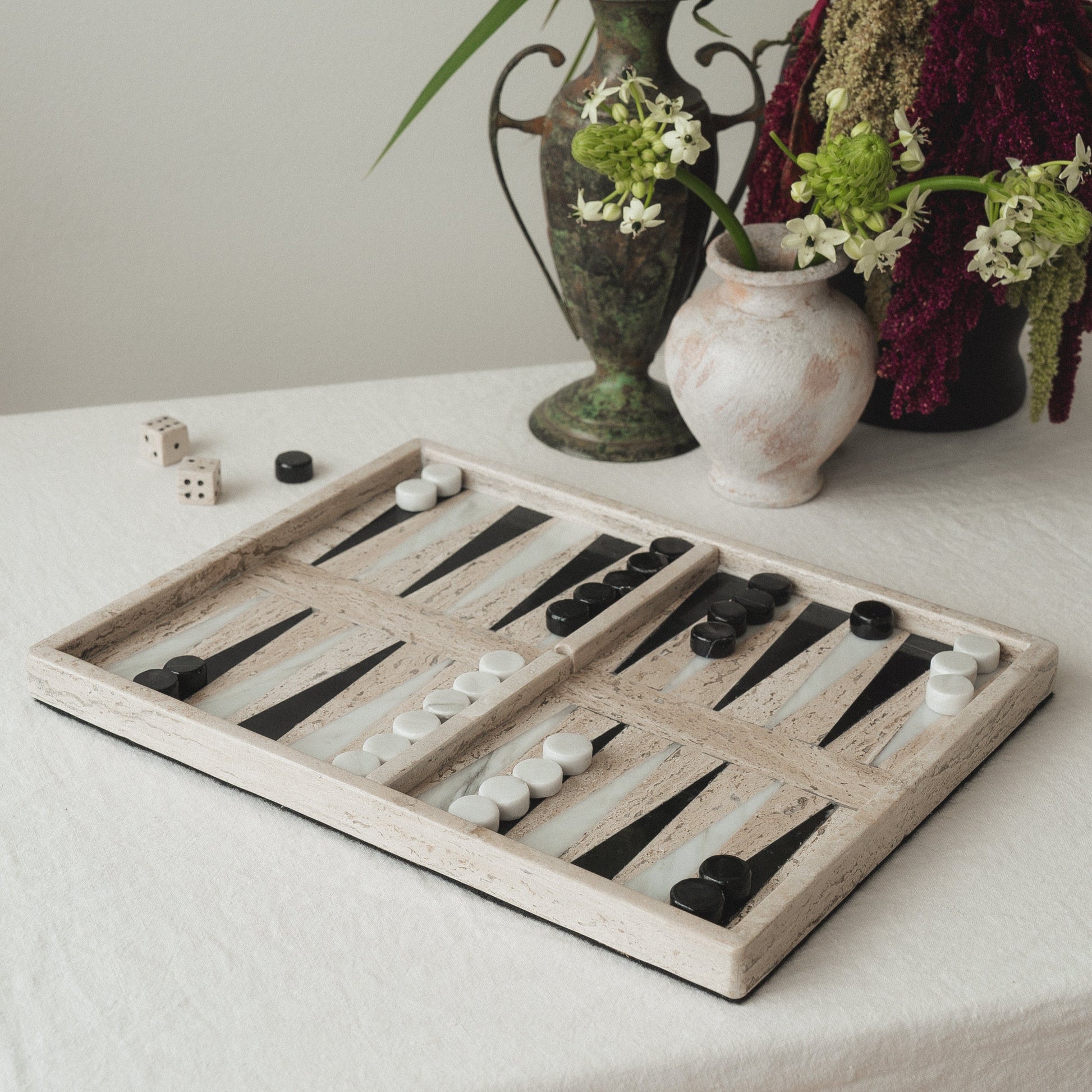 Handcrafted marble backgammon set hand-carved in a stone atelier outside of Mexico City. Perfect for game night or as a tray to serve cocktails at your next gathering. Game board has felted bottom and comes with 15 pieces of each color piece.
