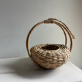 Vintage hand woven basket made from light wood. Features double bent wood handles and raffia wrapping detail on top of handle.