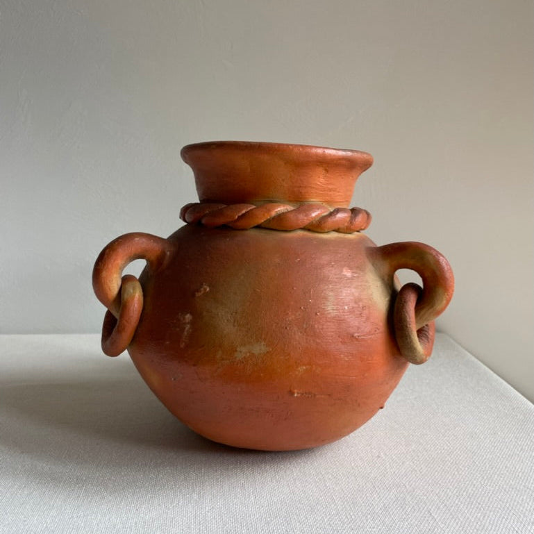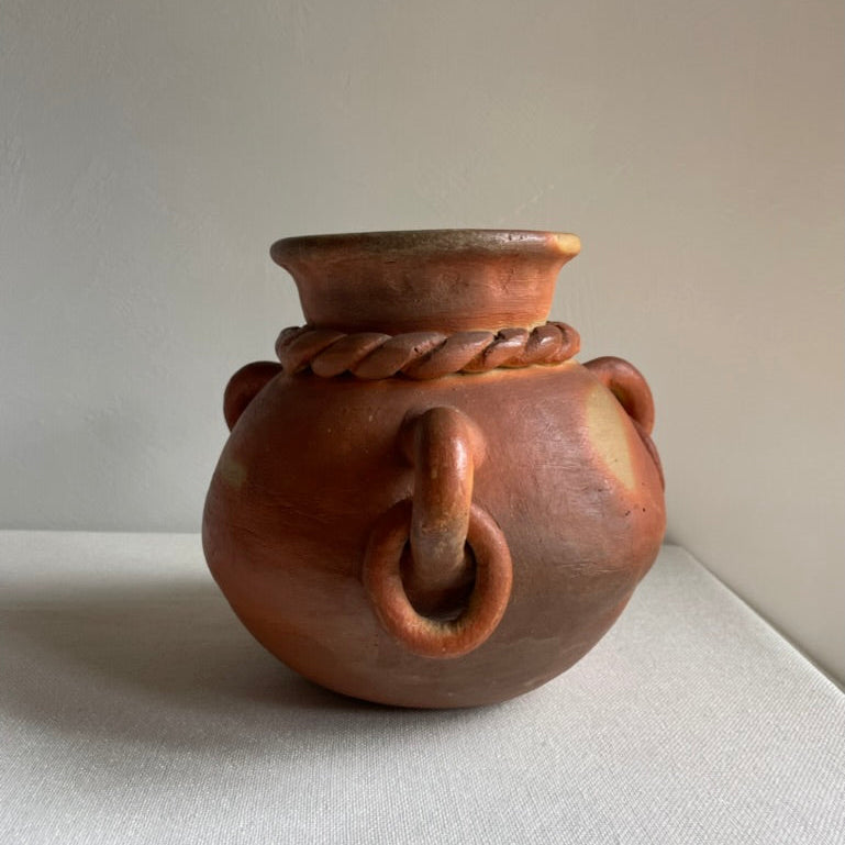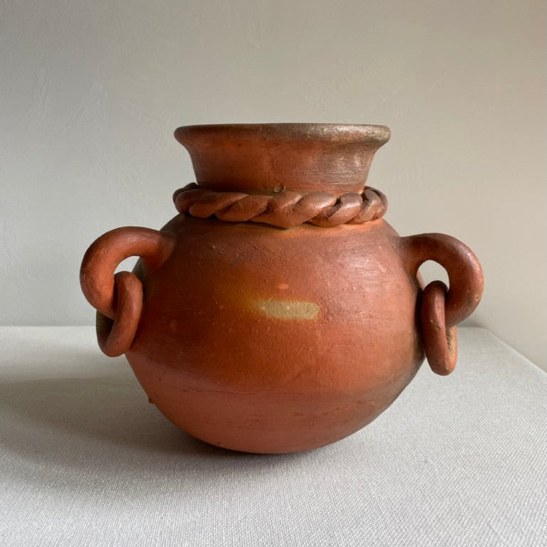 Clay pot with burnished red glaze. Rope detail around the top with three rings around the body. Does not hold water. Sourced in Mexico.