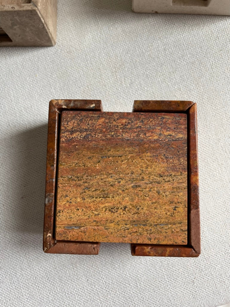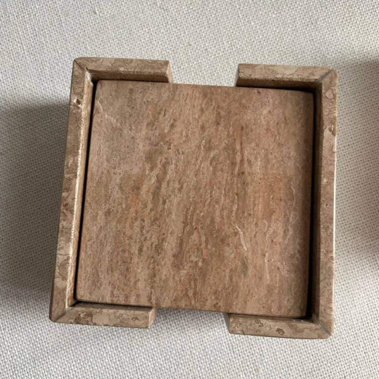 Our onyx coaster sets are hand-carved from blocks of marble individually selected for their impeccable veining. The set features six square coasters in a square case for aesthetic display.