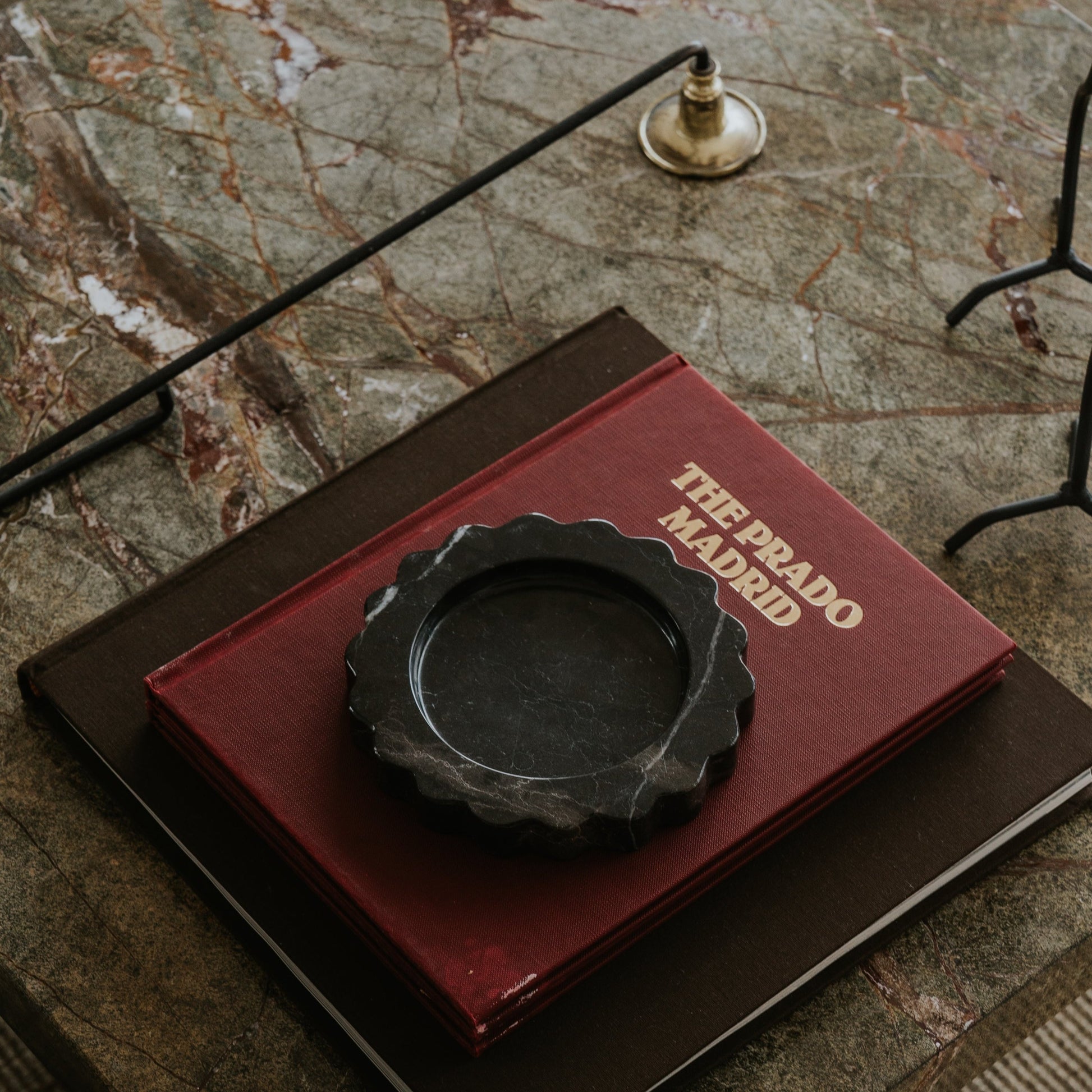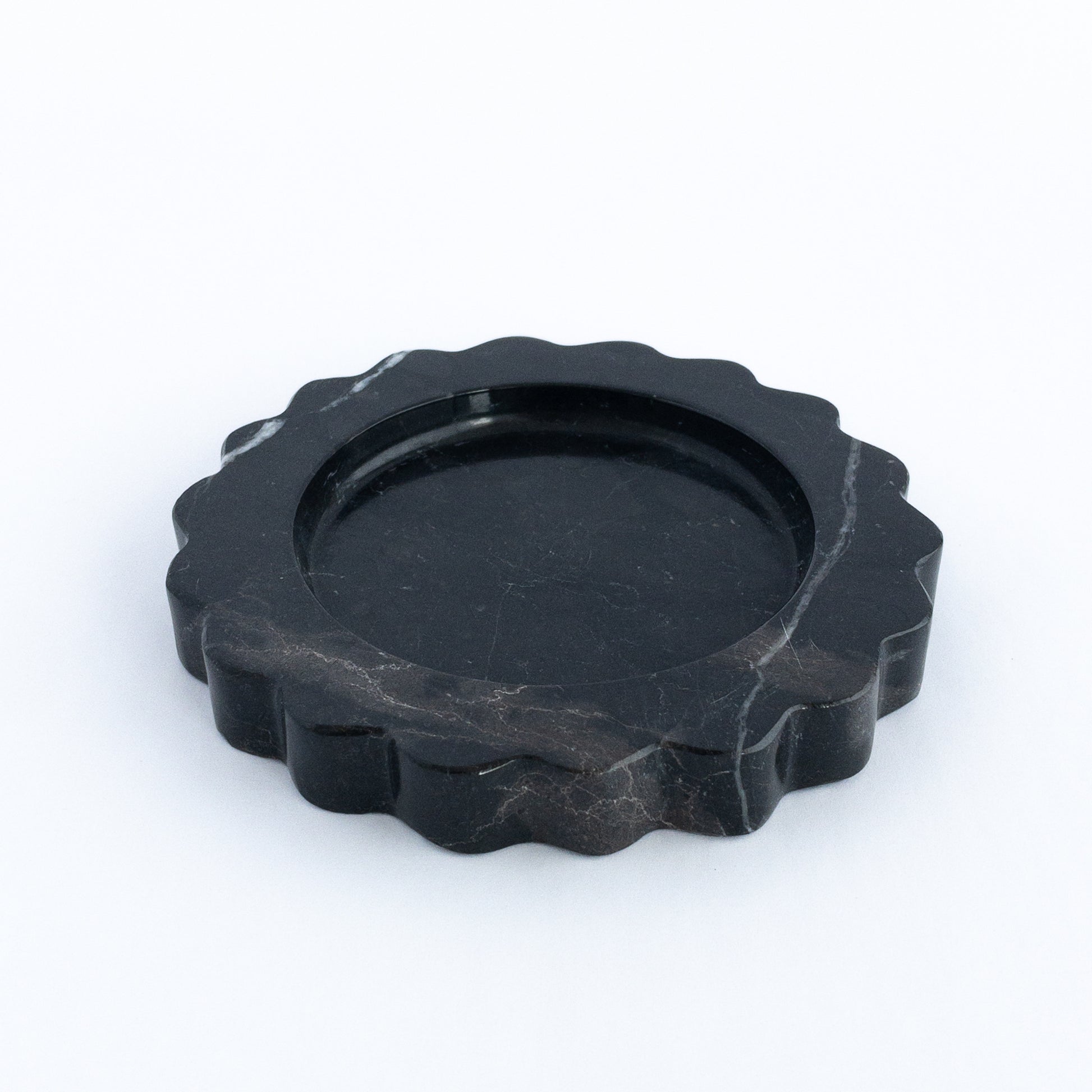 Produced in limited size batches, the flor tray is hand-carved in a family-owned stone atelier outside of Mexico City by artisan craftsmen. Flor - meaning flower in Spanish - represents the undulating petal shapes that decorate this catch-all's rim. The black marble selected for this design has delicate white veins throughout.