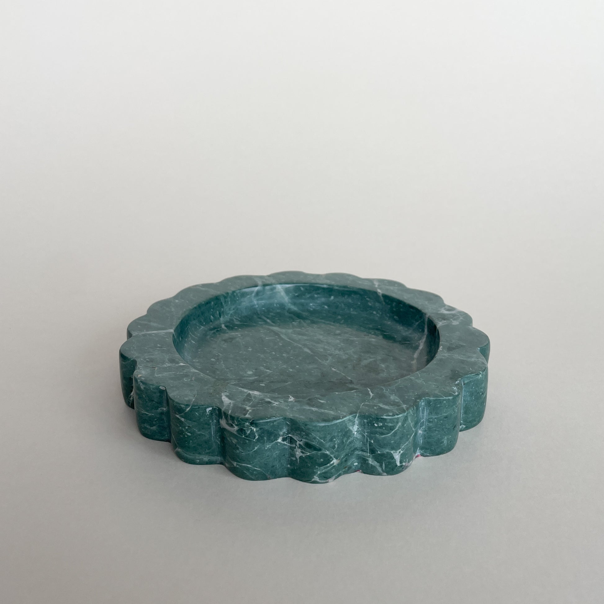 Produced in limited size batches, the flor tray is hand-carved in a family-owned stone atelier outside of Mexico City by artisan craftsmen. Flor - meaning flower in Spanish - represents the undulating petal shapes that decorate this catch-all's rim. The emerald marble selected for this design boasts varying shades of dark green and beautiful brown and black veins.