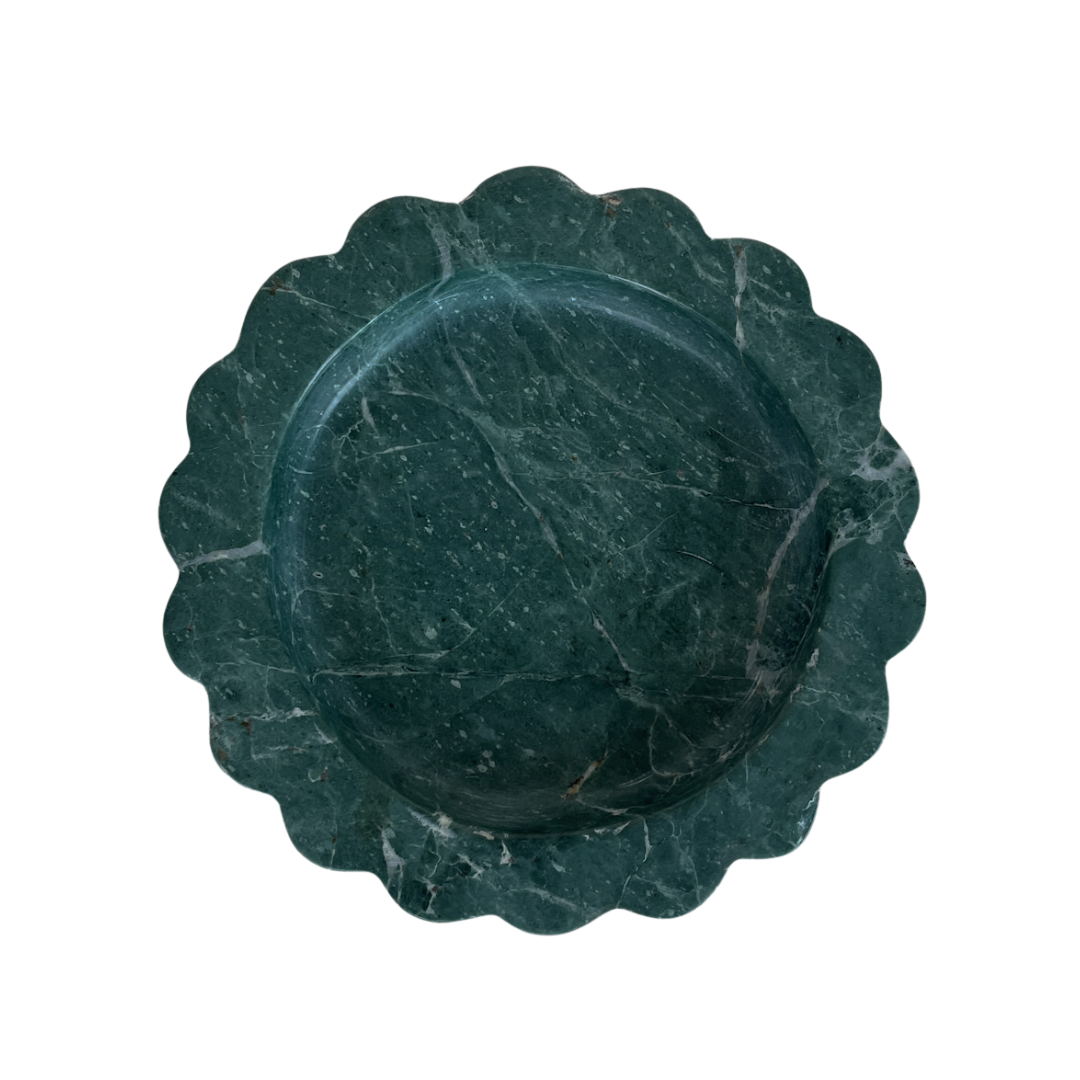 Given this piece is hand-made from natural stone, subtle variations in shape, size, and stone veining should be expected and embraced as part of this piece's beauty. This emerald marble in particular can have some white veins that at first can appear like chips; however, they are a natural part of this beautiful stone.