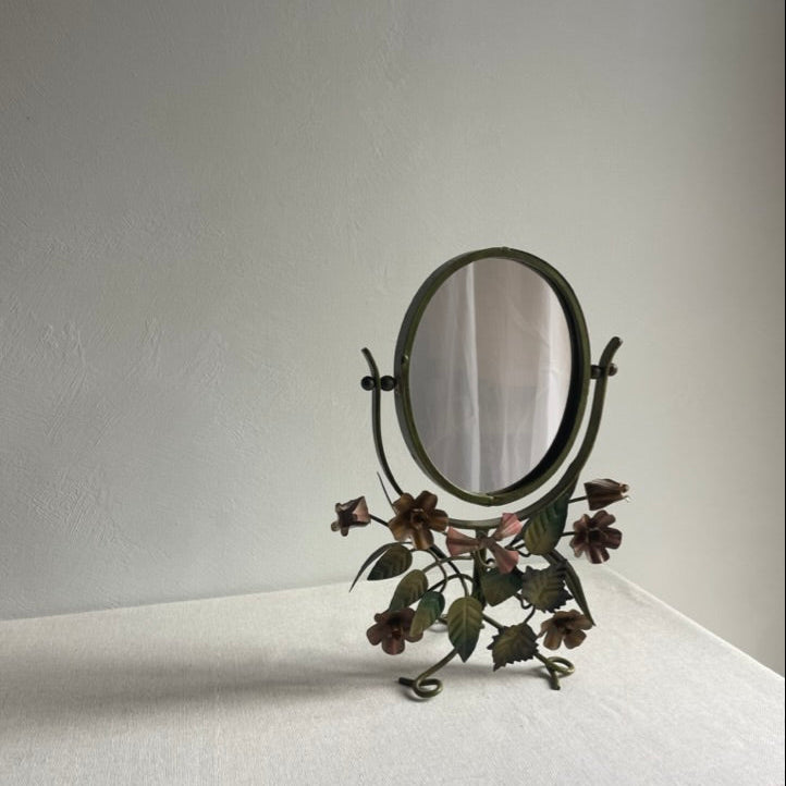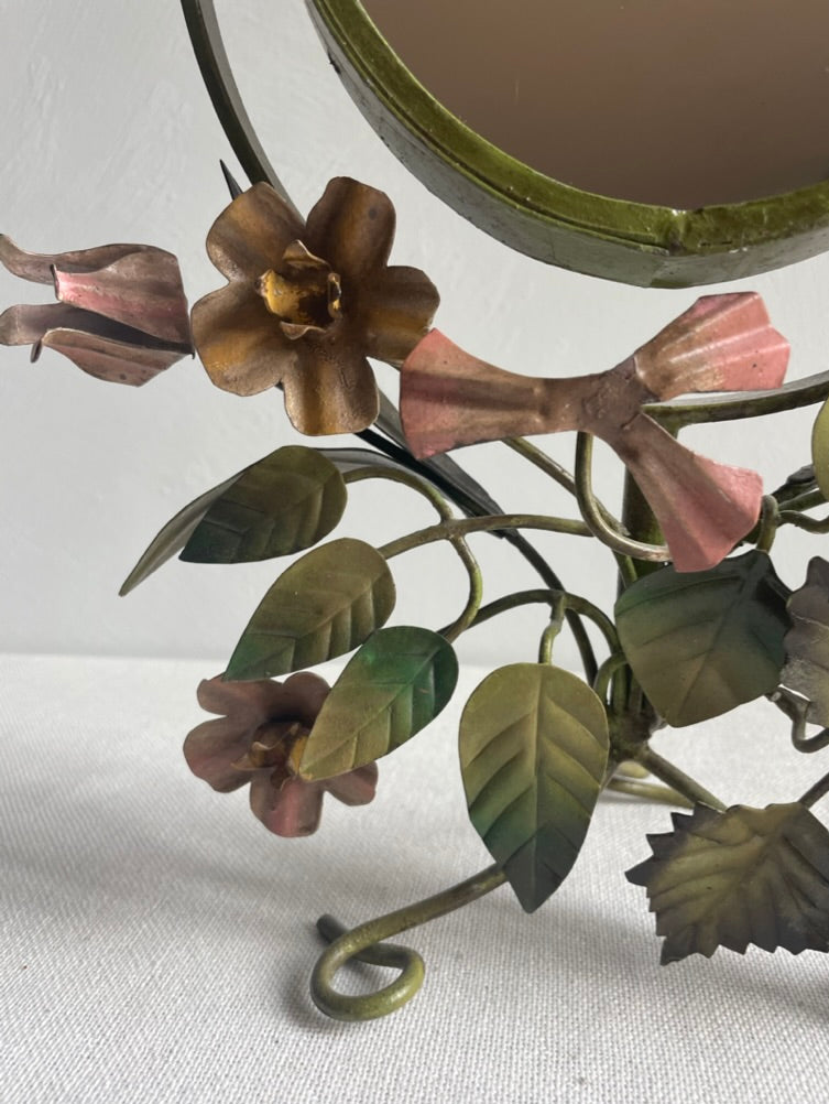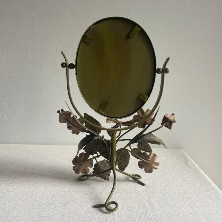Vintage vanity mirror with delicate metal pink flower & olive green petal base design. Mirror swivels a full circle around base.