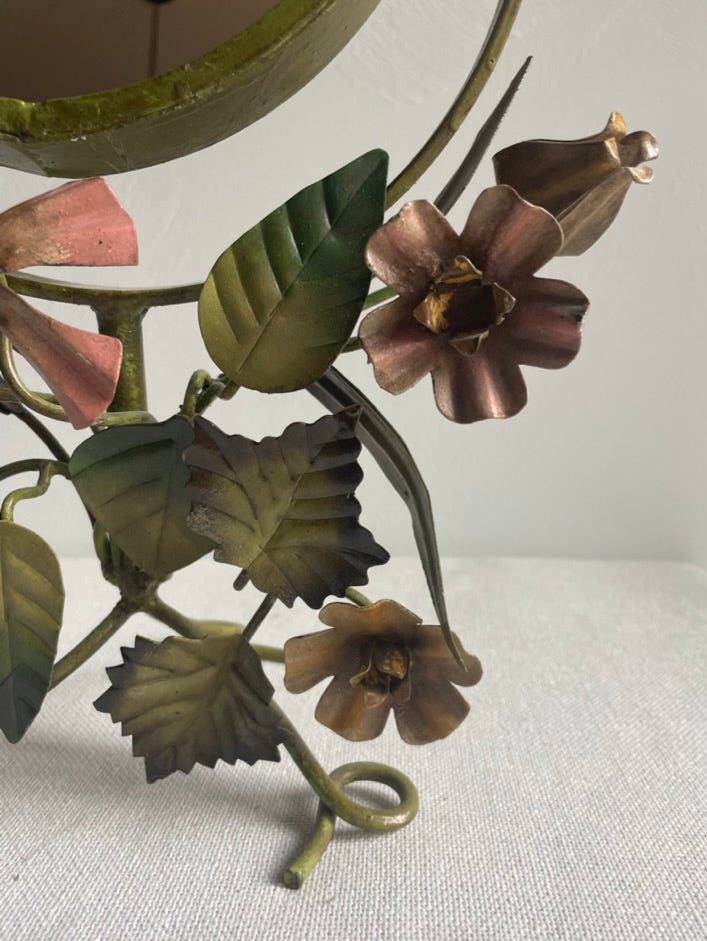 Good vintage condition. One flower on base is missing middle petal. Some small areas where paint has warn away from metal on sides where mirror is attached to frame.