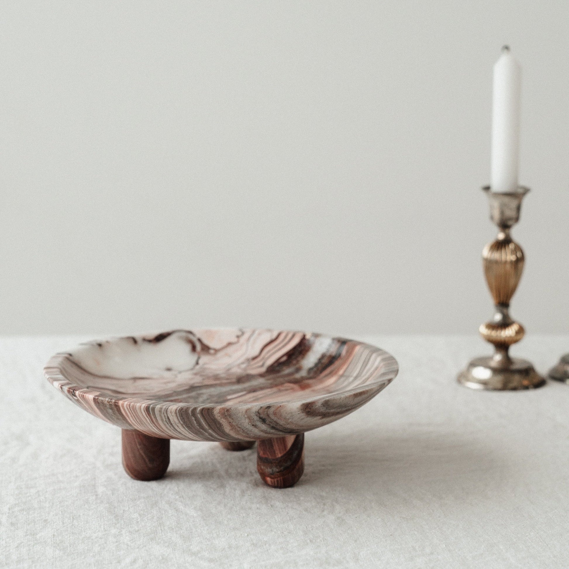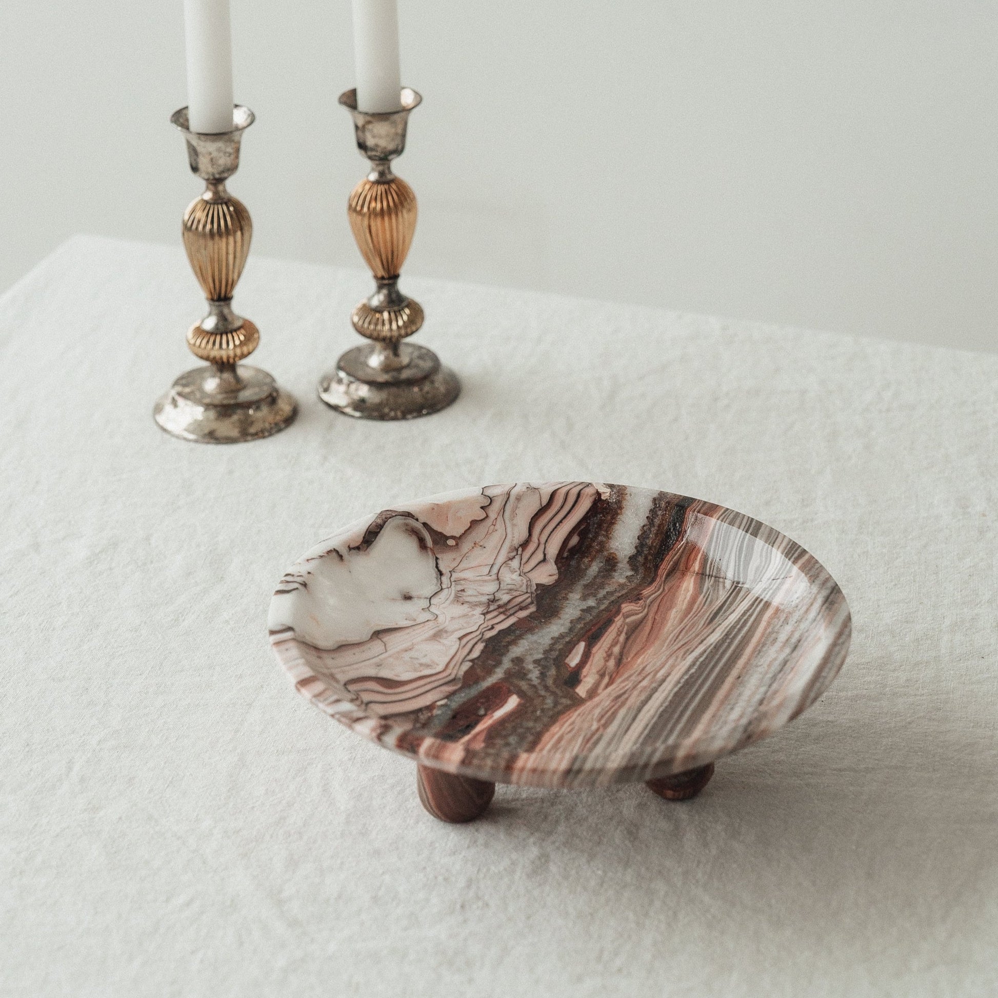Produced in limited size batches, our footed dishes are hand-carved in a family-owned stone atelier outside of Mexico City by artisan craftsmen. Use this dish as a catch-all to organize keys by the backdoor or to serve up a special dish at your next dinner party (but please see our Care Guide for what foods can and can't go on the finished surface).