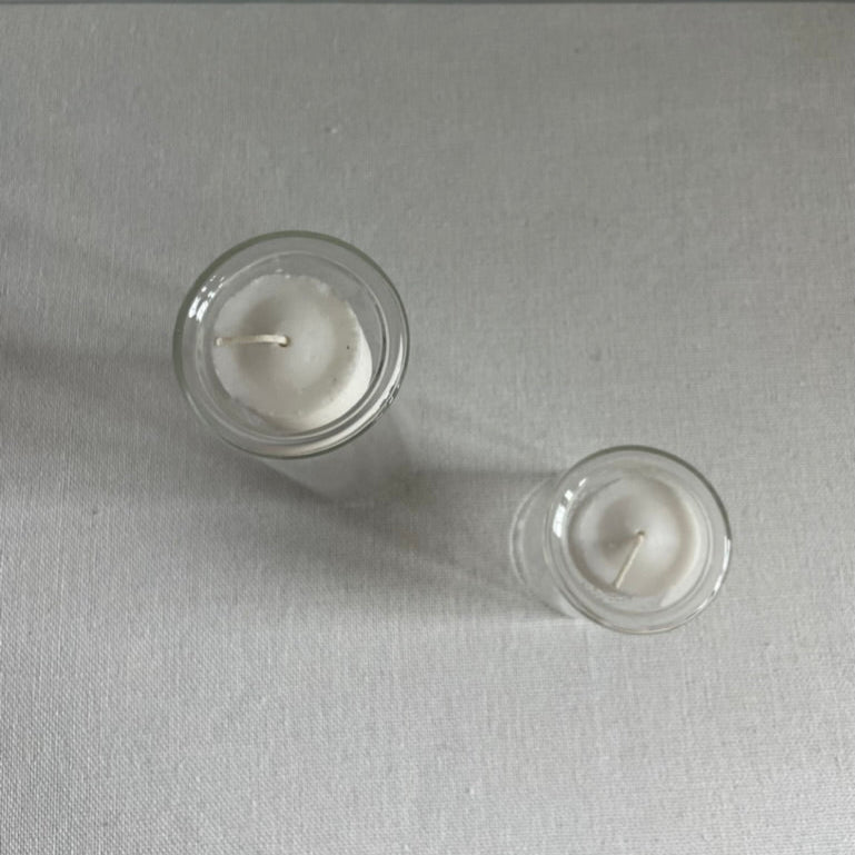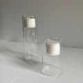 Set of two elevated votive candle holders made from thin glass. Candles included.