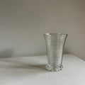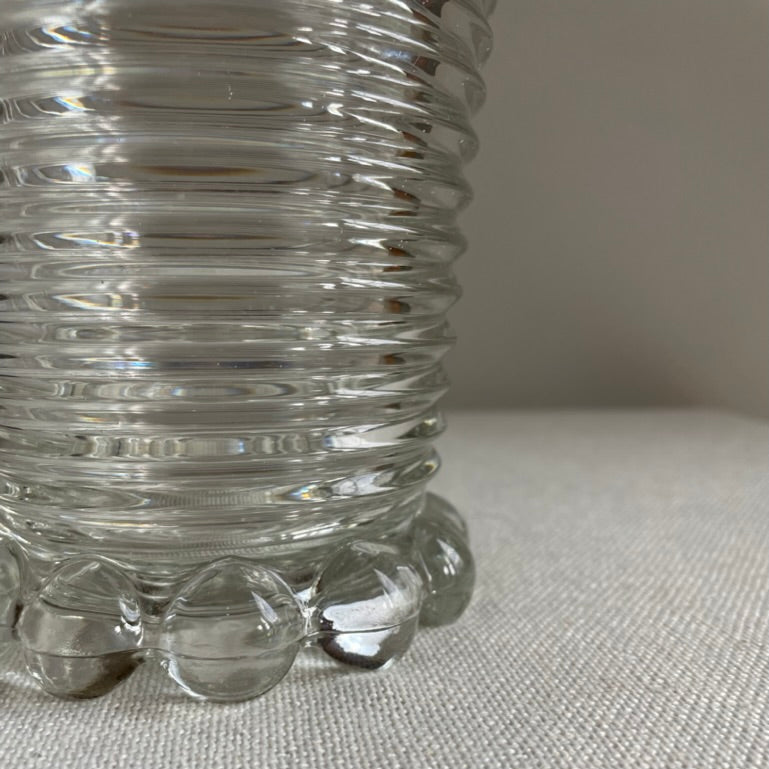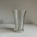Glass vase with horizontal pattern through body and bubble base. Made in a mold and therefore has two lines down sides.