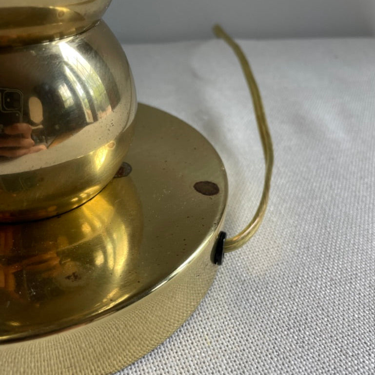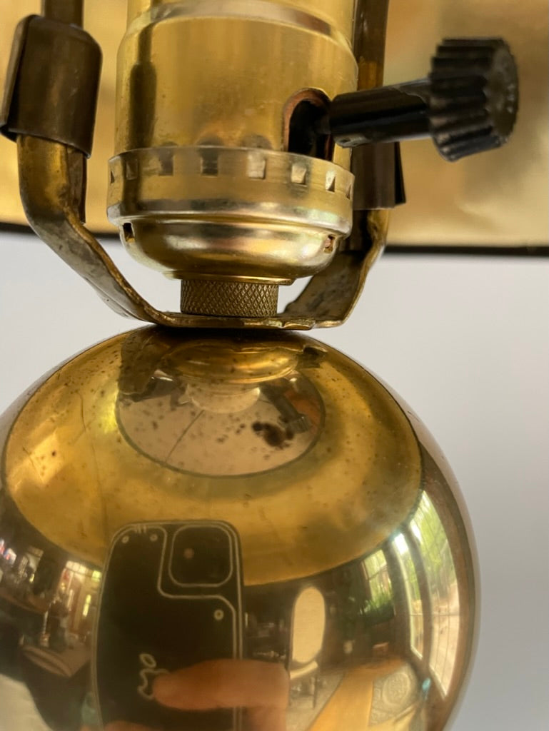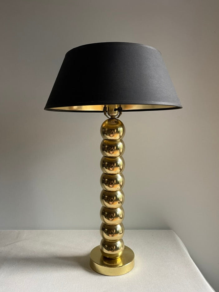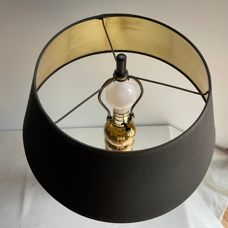 Vintage gold bubble base lamp with black shade with gold inside. Comes with shade, lamp harp and topper. Fully functioning.