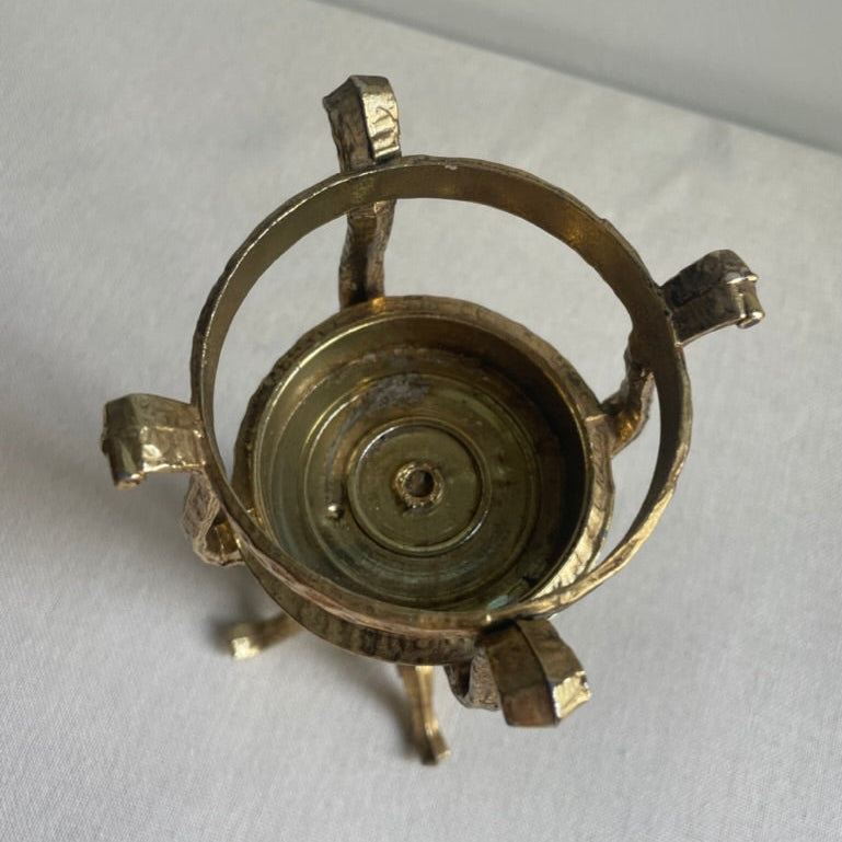 Pedestal goblet shaped candle holder pair with hammered metal and intricate base. Candle opening measures roughly 3" wide. Candles not included.