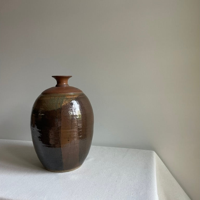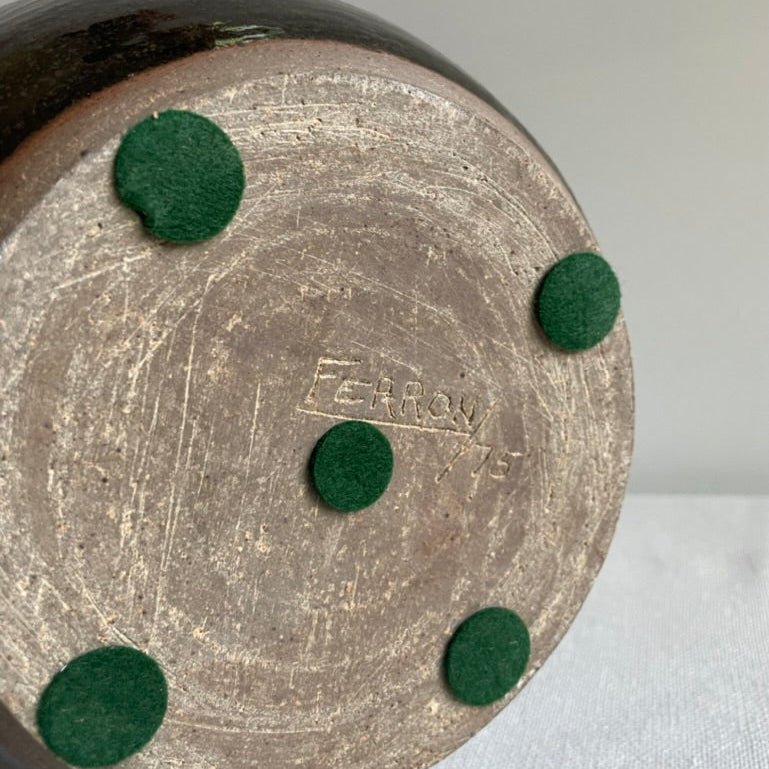 Hand thrown large clay vessel with brown/green glaze. Signed on bottom and dated 1975. Glazed on inside and holds water.