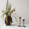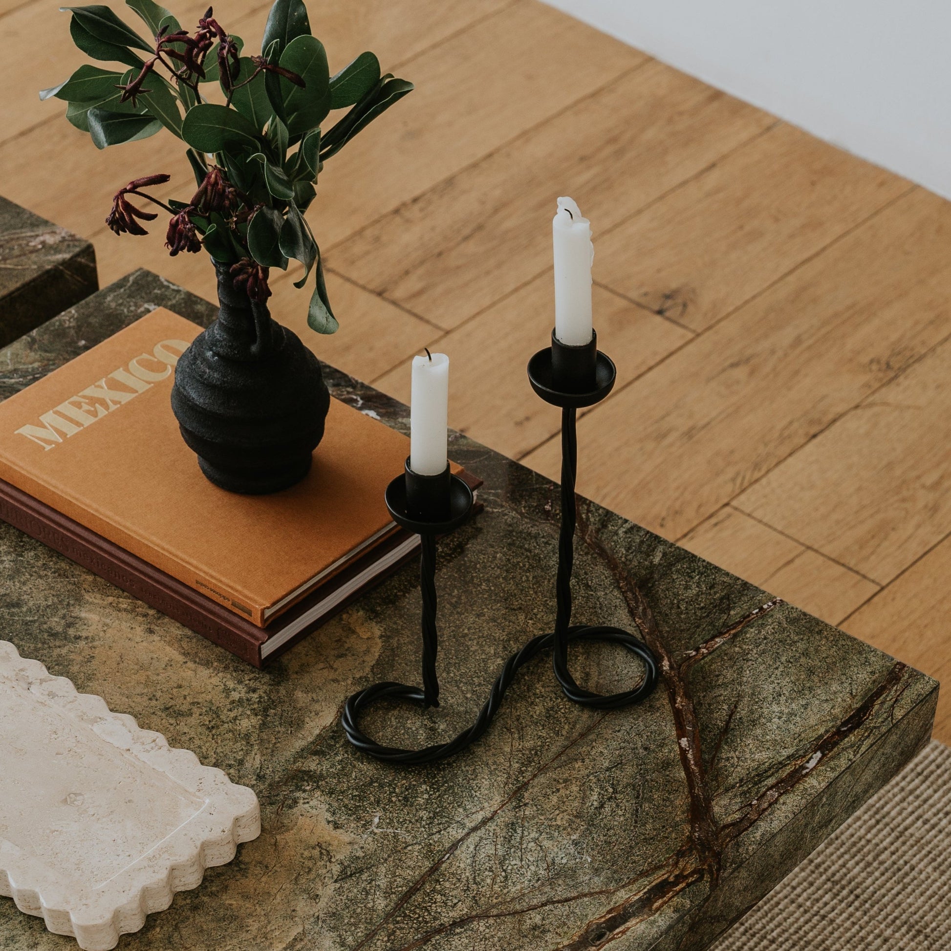 Our Lasso candlestick features a twisted metal base and delicate curves. Designed by The Modern Heirloom in collaboration with Salon 21 of NYC and hand-forged by an artisan blacksmith in Mexico City, Mexico, each candlestick is a unique piece of art. Made from iron and powder coated in matte black.