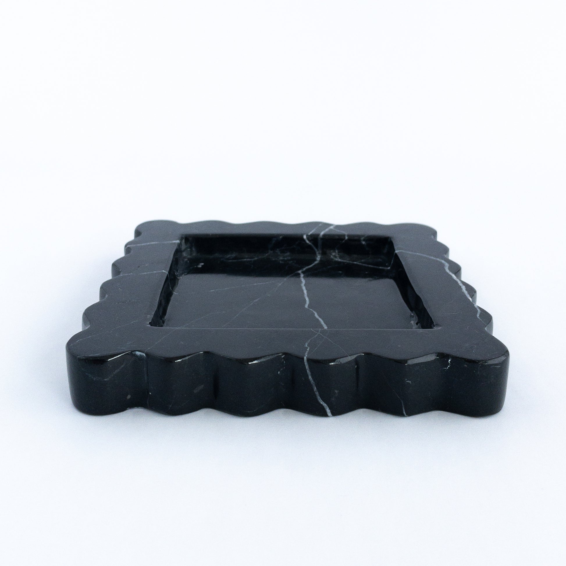The onda catchall is hand-carved in limited-batches at a family-owned stone atelier outside of Mexico City by artisan craftsmen. The scalloped sides of this catch-all represents the ondas - meaning wave in Spanish - of the ocean. The black marble hand-picked for this design has delicate white veins throughout.