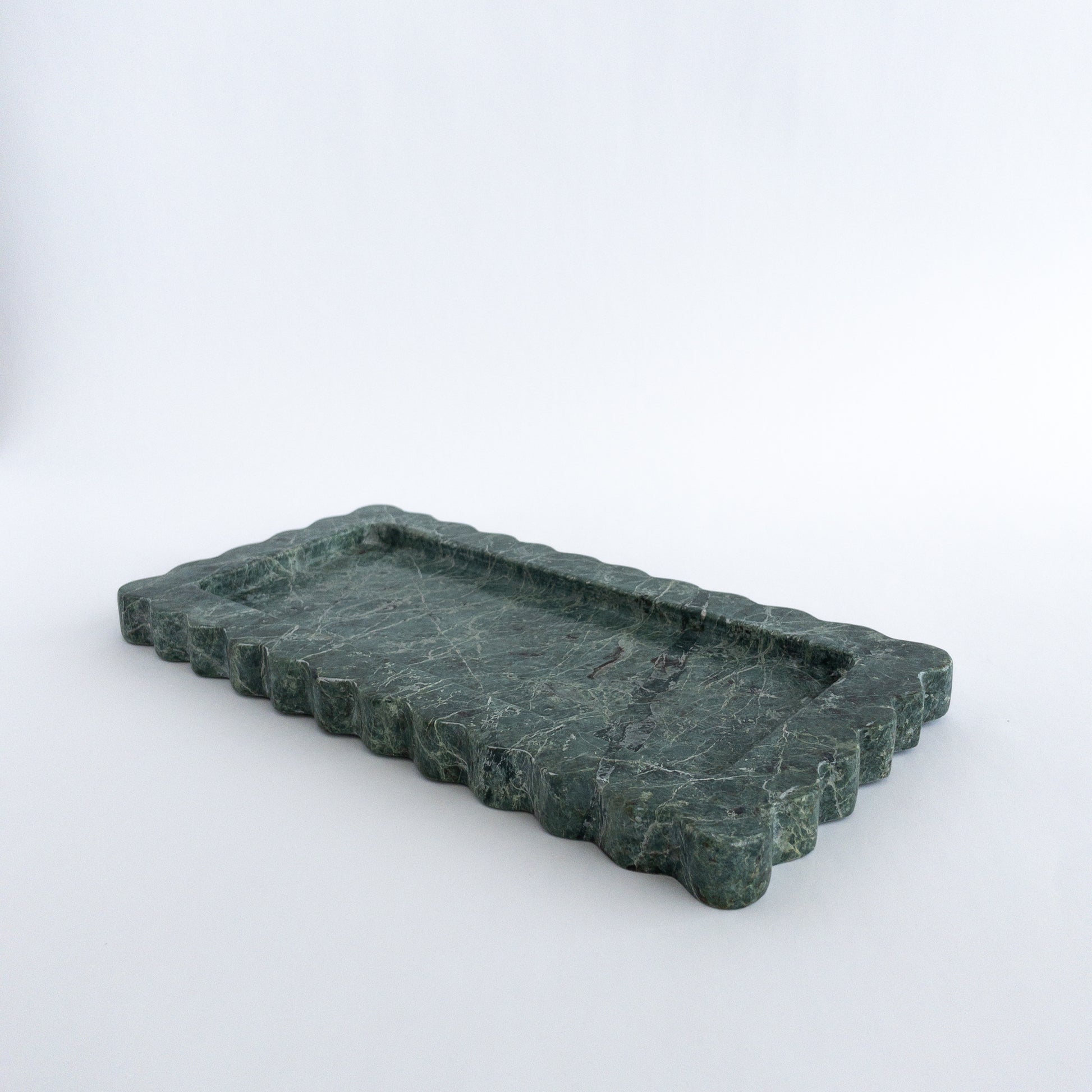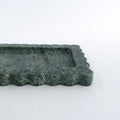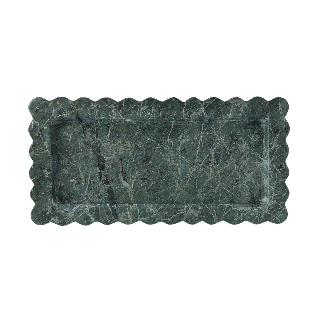 The onda tray is hand-carved in limited-batches at a family-owned stone atelier outside of Mexico City by artisan craftsmen. The scalloped sides of this tray represents the ondas - meaning wave in Spanish - of the ocean. The emerald marble selected for this design boasts varying shades of dark green and beautiful brown and black veins.