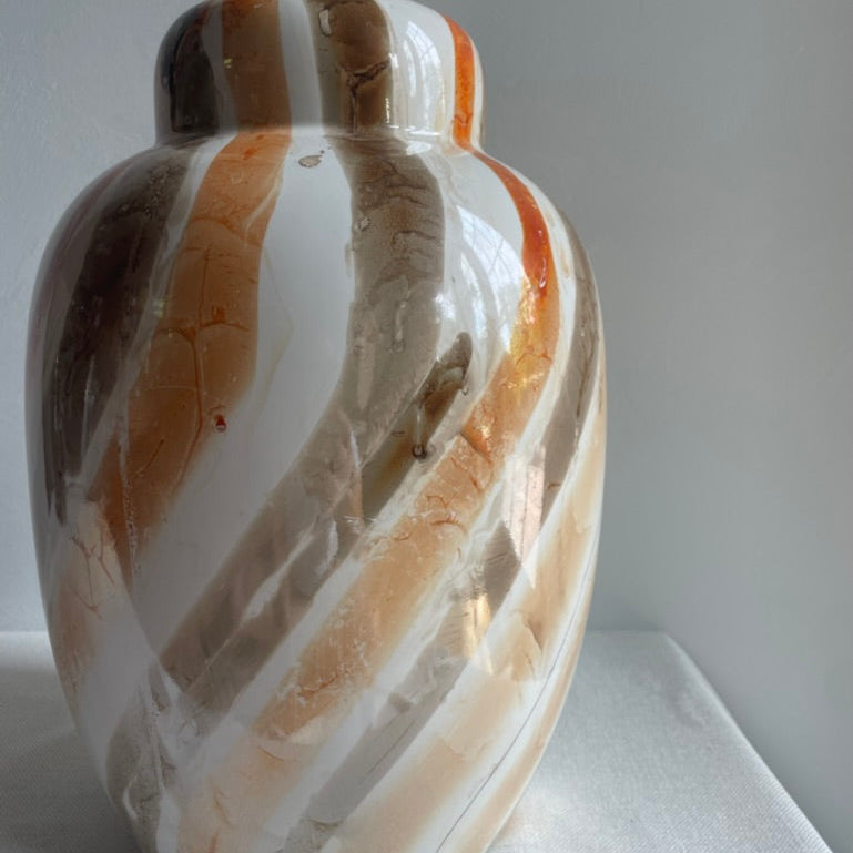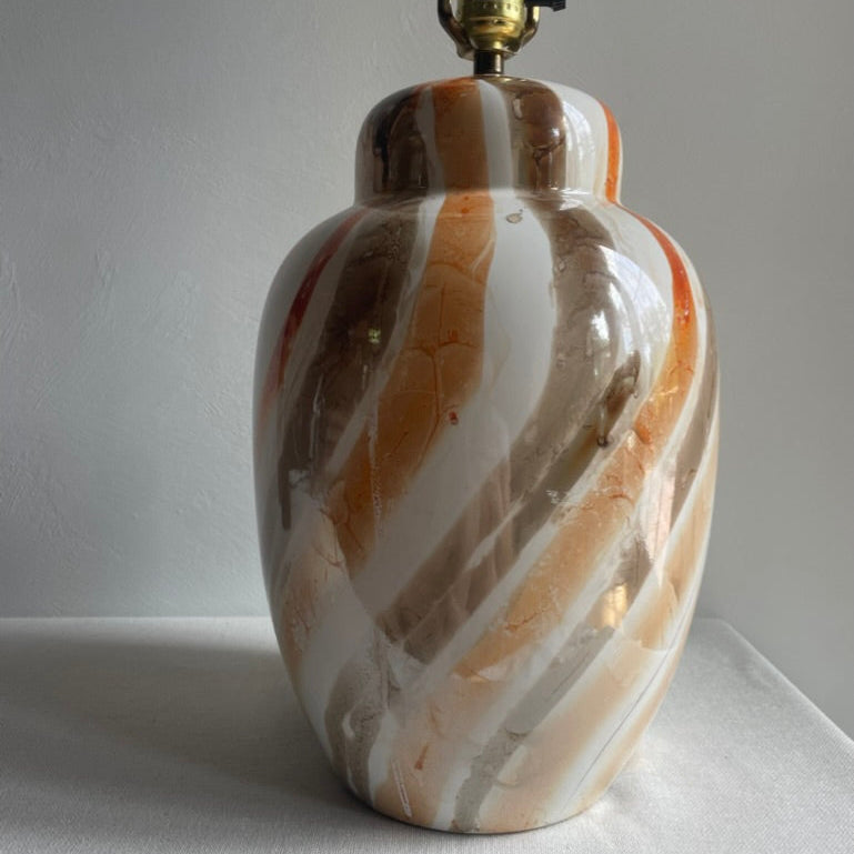 Vintage ceramic lamp base with hand painted white, brown/gold, and orange brush strokes. Finished with an iridescent glaze. Does not come with a shade or lamp harp.