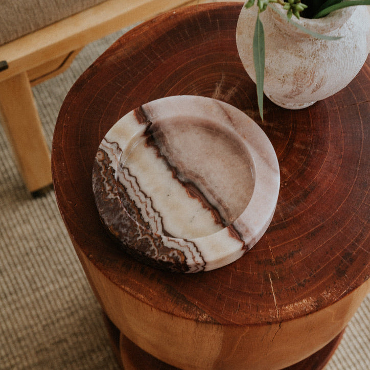 Our sol catchall is hand-carved in a family-owned stone atelier outside of Mexico City by artisan craftsmen. Sol - meaning sun in Spanish - is a Mexican symbol for energy & good luck. The blocks of onyx this limited production catch-all is cut from are hand selected for their unique pink color and multi-colored veining.