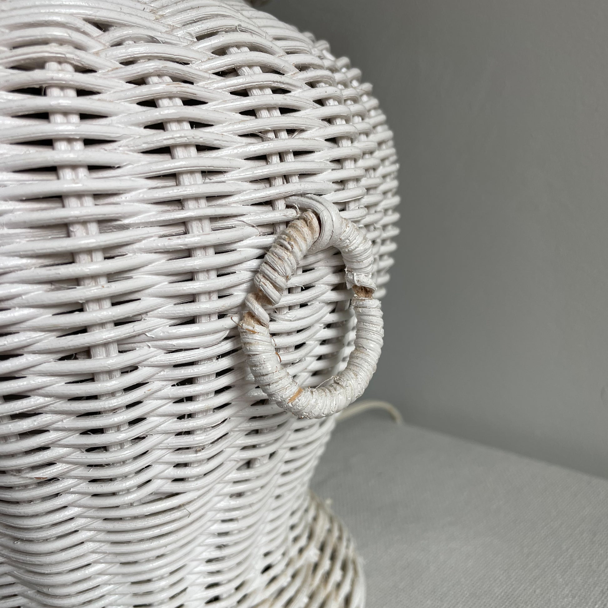 Excellent condition. Only damage to wicker is to wicker ring on one side of lamp (see photo). Wiring is fully functional.
