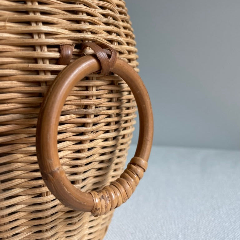 Wicker vase shaped vessel with wooden ring details on two sides.