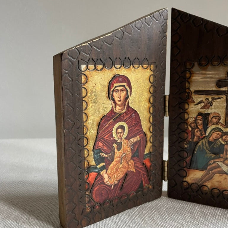 Vintage wooden two-fold wooden religious relic. Features religious images and pattern burned into the wood. Edges painted gold. Sourced in Mexico City.